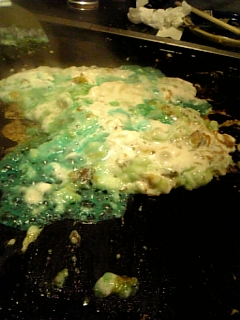 写真は「ブルーハワイもんじゃ」!産業廃棄物でもエイリアンの肉片でもないですよww